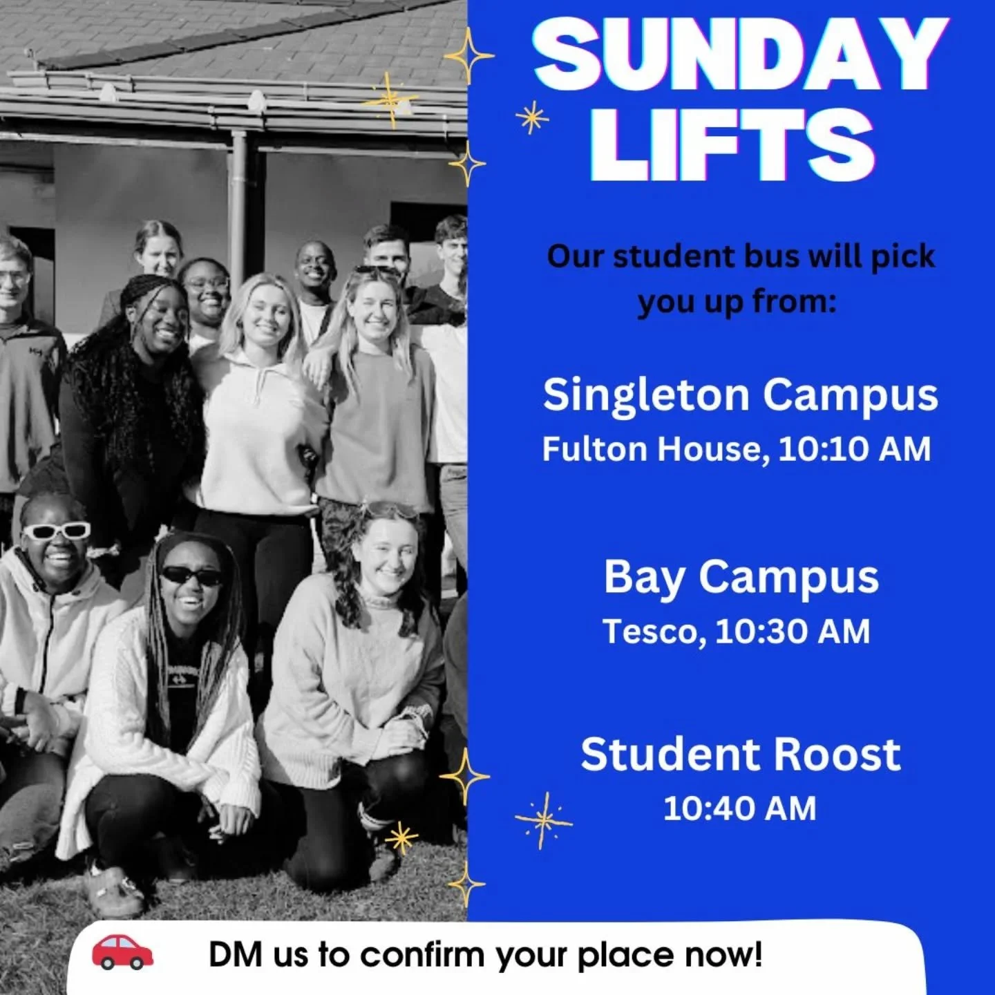 If you are new to Swansea, weโve got you covered! We have a mini bus which will pick you up from the city centre and student villages which will bring you directly to church! Just DM/Email us for more information!